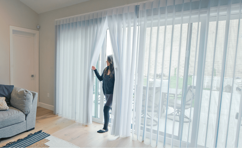 Unlike traditional drapery, Smart Drape Shades™ redefine convenience. The individually suspended veins in flowing sheer fabric allow you to move in and out of your home seamlessly even when the shades are closed. This innovative design eliminates the need to open and close the shades each time you use the door.